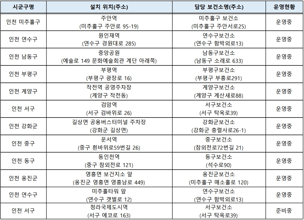 수도권 임시선별진료소 운영 위치 (인천)