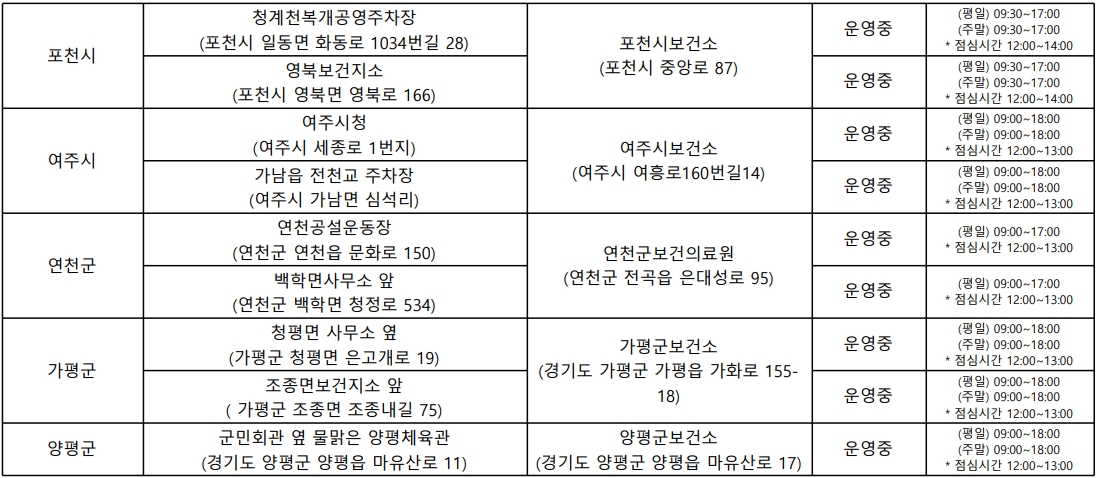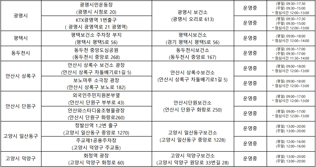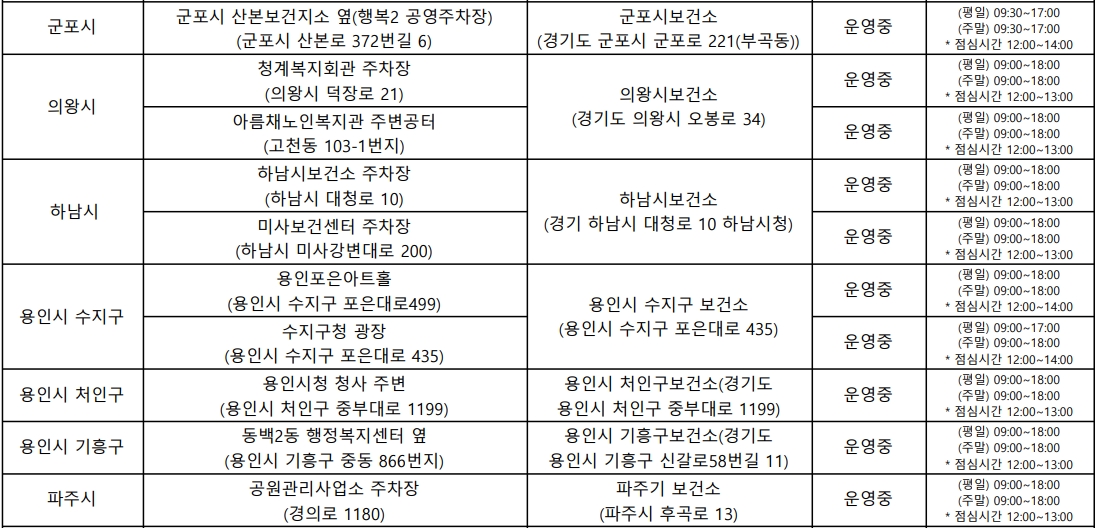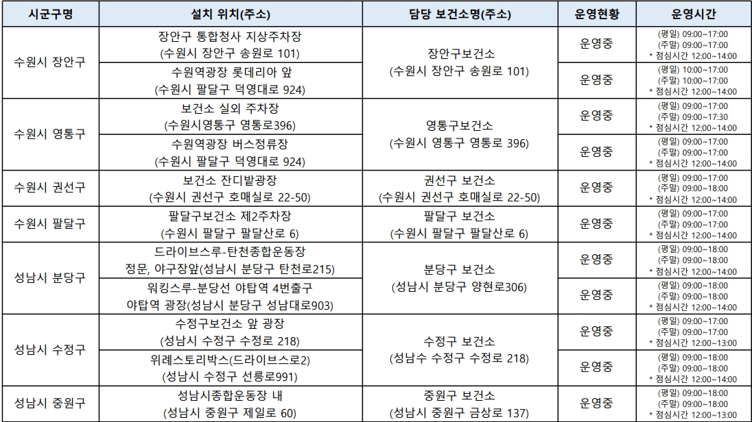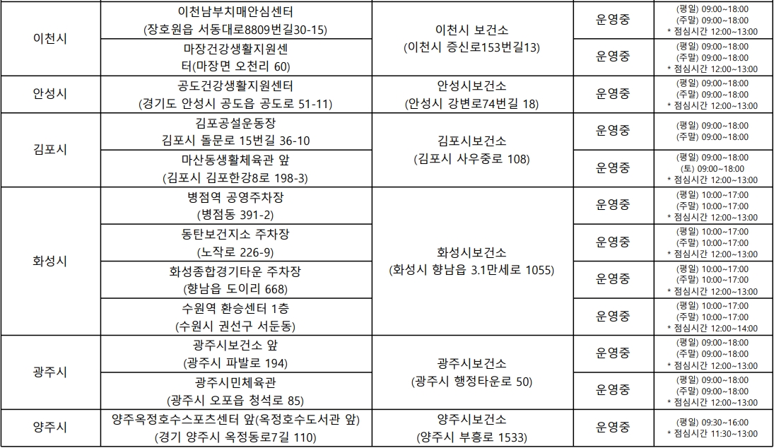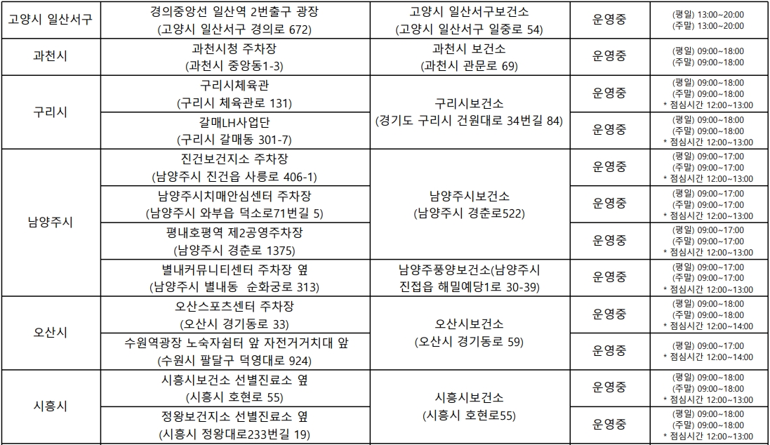 운영시간은 시군구와 임시선별진소에 따라 약간씩 다르며, 수도권 임시선별진료소 방문시 아래 표에 기재된 운영시간을 확인하고 방문하시기 바랍니다.