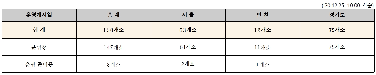 12월 25일 기준 150개소 수도권 임시선별진료소가 운영중에 있고,