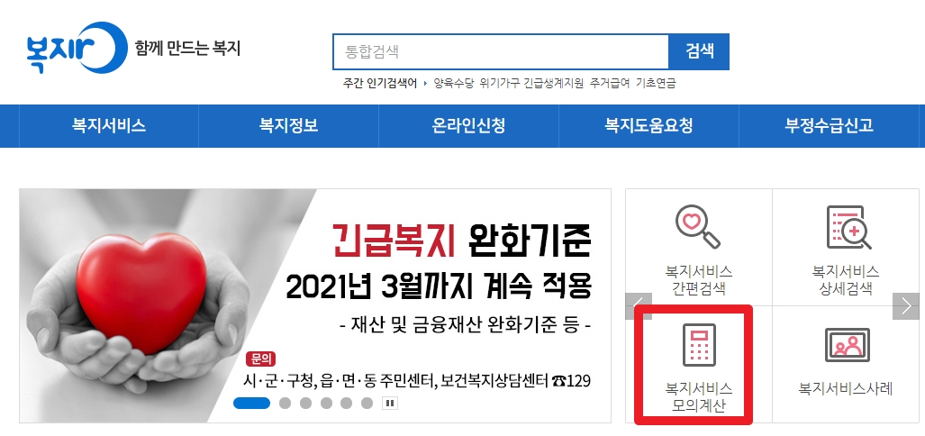 코로나로 인해 대면이 어렵고 껄끄러운 시기이기에 온라인으로 먼저 2021년 기초생활수급자 자격요건, 자격 모의계산을 해보시는 것도 도움이 되실 것 같고, 인터넷 사용이 어려운 경우라면 국번 없이 129를 통해서도 자세한 상담을 받아보실 수 있습니다.