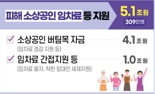 소상공인 버팀목 자금으로 4.1조 원이 편성되었는데 코로나 확산으로 인해 강화된 사회적 거리 두기와 연말연시 방역 강화로 인해 피해를 입은 소상공인 지원에 초점이 맞춰져 있습니다.