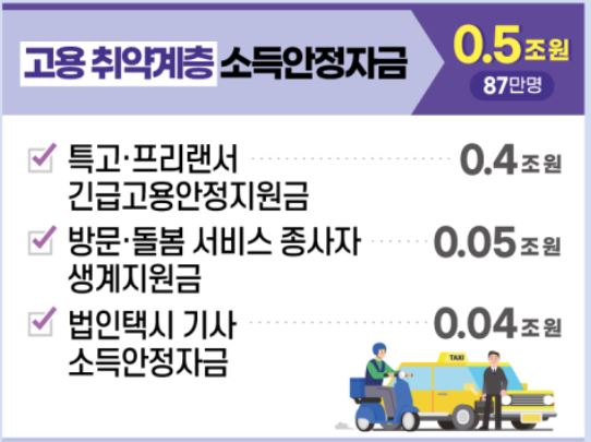 3차 재난지원금 고용 취약계층 소득안정자금으로는 87만 명이 지원을 받을 수 있으며 0.5조 원이 편성되었습니다.